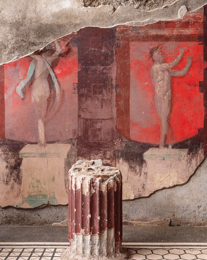 Inside a large house in a part of Pompeii called Regio IX, a team from the Archaeological Park of Pompeii unearthed a splendidly decorated dining room that eighteenth-century excavators had stumbled upon but largely ignored. Opening onto a garden, the vaulted room is lined with partially preserved columns painted a rich red that frame frescoed wall panels. Archaeologists were surprised to discover that the frescoes represent a rare example of a megalography—a group of paintings depicting nearly life-size figures, in this case part of the retinue of Dionysus, the god of wine. Researchers have dubbed the residence the House of the Thiasus, after the term for a Dionysian procession, and have dated the frescoes to between 40 and 30 b.c. on the basis of their style.