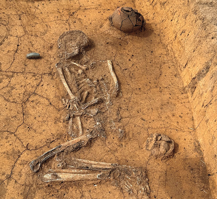 A decorated bag used to carry something particular, or for a special occasion such as a night on the town, is often used to signal wealth and status. This seems to have been true as well for members of the Corded Ware culture, which spread throughout Europe in the third millennium b.c. During installation of a power line in the eastern German town of Krauschwitz, archaeologists discovered 15 Corded Ware burials of men and women interred with distinct sorts of artifacts. “People in this period differentiated men from women by including certain types of objects, such as axes for men and jewelry for women, in their graves,” says archaeologist Oliver Dietrich of the State Office for Heritage Management and Archaeology Saxony-Anhalt.