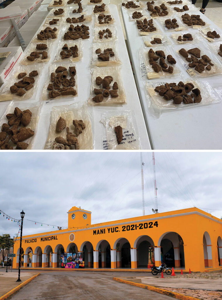 Evidence of this auto-da-fé lay hidden for more than 450 years after Landa orchestrated the savage event in Maní. Archaeological work in the small city was largely focused on its cenote, a sinkhole that provided water to the ancient population, in which Yucatán’s earliest ceramics, dating to around 1000 b.c., have been unearthed. Then, in January 2015, as part of a campaign to have Maní declared a Pueblo Mágico, or Magical Town, a designation intended to encourage tourism in out-of-the-way Mexican locales, workers began to dig drainage holes in a plaza in front of the palacio municipal, or city hall. They soon came upon a large concentration of ceramic fragments and contacted authorities at Mexico’s National Institute of Anthropology and History. Archaeologist Tomás Gallareta Negrón was called in to carry out a limited rescue excavation in cooperation with Fomento Cultural Banamex and the Yucatán government.