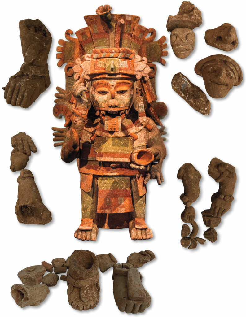 In all, several thousand sherds were uncovered in front of Maní’s city hall. Some of the fragments were found intermingled with pieces of charcoal and show traces of burning. Archaeologists have determined that almost all are parts of a specific type of incensario, or incense burner, dating to the Late Postclassic period (1300–1450). These vessels typically measure between four and 20 inches tall and were used to burn fragrant resins and gums such as copal or rubber as offerings. They generally include a representation of a deity, such as the creator god Itzamná or the rain god Chahk, and their purpose was to link the living Maya to their gods and ancestors.