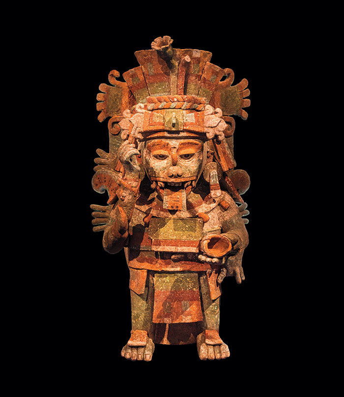 In all, several thousand sherds were uncovered in front of Maní’s city hall. Some of the fragments were found intermingled with pieces of charcoal and show traces of burning. Archaeologists have determined that almost all are parts of a specific type of incensario, or incense burner, dating to the Late Postclassic period (1300–1450). These vessels typically measure between four and 20 inches tall and were used to burn fragrant resins and gums such as copal or rubber as offerings. They generally include a representation of a deity, such as the creator god Itzamná or the rain god Chahk, and their purpose was to link the living Maya to their gods and ancestors.