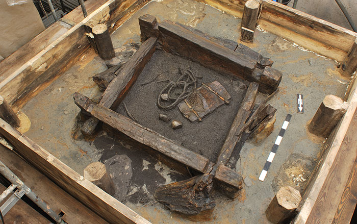Although almost nothing remained of its original wooden framework, over the course of 1,300 years, the ship’s rotting timbers left a perfect impression in the soil, allowing archaeologists to determine its exact design and size. The burial chamber was furnished with gold and garnet jewelry, silver bowls, coins, drinking horns, iron swords and spears, and a stunning warrior helmet and facemask, which, with its tinned bronze and gilt decoration, has become the iconic symbol of Anglo-Saxon archaeology. Many experts have concluded, based on the richness of the grave goods and the size of the ship, that the tomb is that of Rædwald, the most powerful king of East Anglia, who died around A.D. 625.